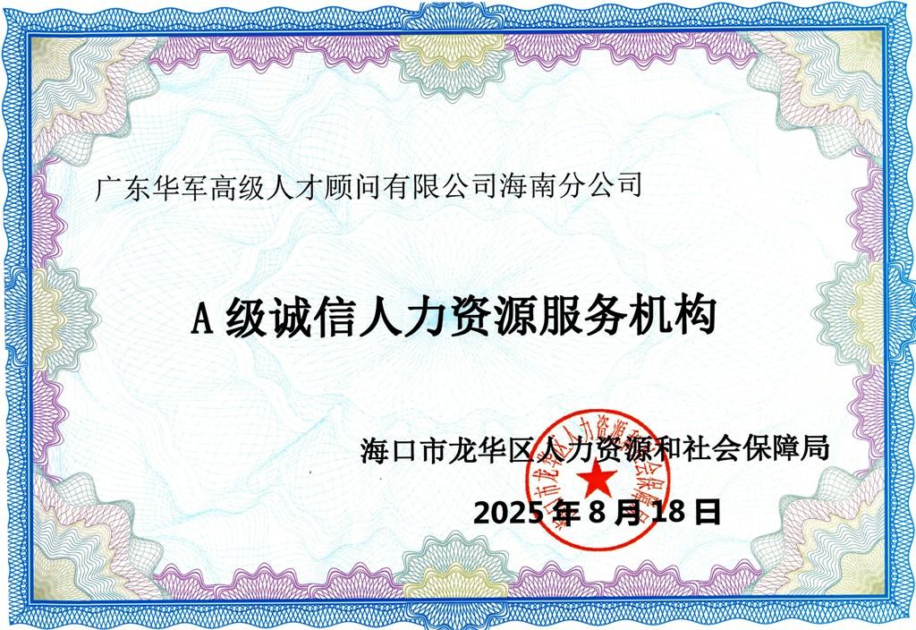 广东华军高级人才顾问有限公司及旗下海南分公司,作为华南地区人才服务行业的标杆品牌,自创立以来始终秉承“高端引领、精准匹配、全局赋能”的服务理念,致力于为企业与高端人才搭建无缝对接的桥梁,推动区域经济与人才生态的协同发展与持续繁荣。广东华军高级人才顾问有限公司成立于2012年,积累了深厚的行业底蕴与丰富的实战经验;海南分公司则于2023年正式设立,成为华军战略布局在粤港澳大湾区与海南自由贸易港两大经济区域的重要组成部分。总公司与分公司实行非独立核算机制,由总公司统一实施战略统筹、财务管理与资源整合,具备全面合规的运营资质与专业权威的行业认证,持有琼人服证字(2023)第0102003023号人力资源服务许可证、海龙审批复(2023)373号行政审批许可以及LH202405216202023号经营性人力资源服务行政审批备案,并荣获A级诚信人力资源服务机构称号,彰显出卓越的品牌公信力与服务实力。